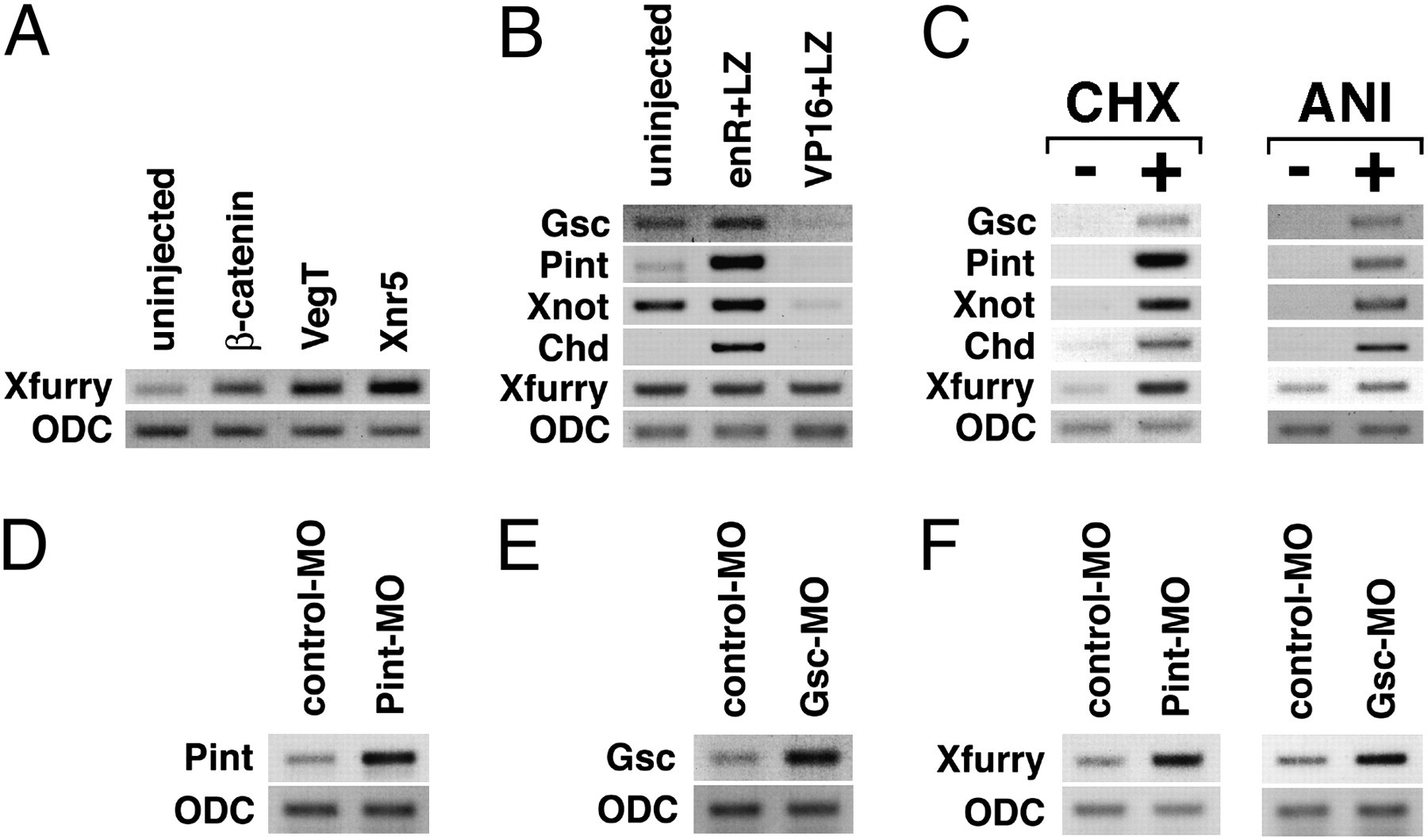 Fig. 3. Target genes of Xfurry and their superinduction. (A) Early inducers β-catenin, VegT, and Xnr5 induced transcripts of Xfurry (stage 10). (B) enR+LZ induced chordamesodermal genes in the pre-MBT cycloheximide-treated animal caps, and VP16+LZ reduced or did not alter expression of those genes (stage 10). (C) Superinduction in the animal caps treated with both cycloheximide (CHX) (Left) and anisomycin (ANI) (Right) (stage 10). (D) Injection of pintallavis-MO induced expression of pintallavis (stage 10). (E) Injection of goosecoid-MO induced expression of goosecoid (stage 10). (F) Injection of both pintallavis-MO and goosecoid-MO induced expression of Xfurry (stage 10).