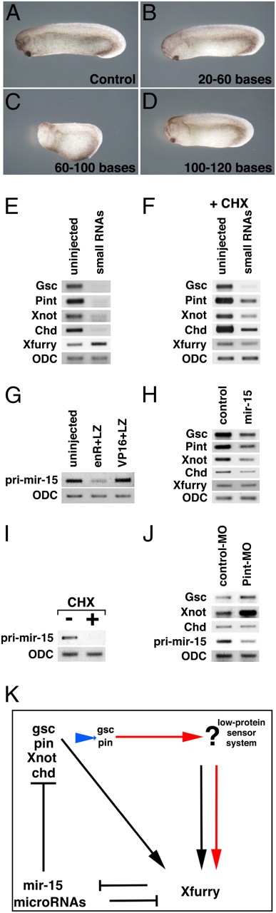 Fig. 4. The role of small RNAs in gene expression. (AâD) Phenotypes of small RNA-injected embryos (stage 30). (A) Control embryo. (BâD) Small RNAs in the range of 20â60 (B), 60â100 (C), and 100â120 (D) bases were injected into dorsal blastomeres of four-cell embryos. (C) Injection of small RNAs (60â100 bases) shortened the dorsal axis in all embryos (n = 56). (E) Injection of small RNAs (60â100 bases) into all blastomeres of four-cell embryos markedly reduced the expression of chordamesodermal genes but increased expression of Xfurry (stage 10). (F) Injection of small RNAs (60â100 bases) into four animal blastomeres of 32-cell embryos in solution containing cycloheximide decreased expression of chordamesodermal genes in the animal caps and slightly reduced the expression of Xfurry (stage 10). (G) Expression of enR+LZ reduced pri-mir-15, and expression of VP16+LZ slightly up-regulated pri-mir-15 in the cycloheximide-treated animal caps (stage 10). (H) Overexpression of mir-15 in the cycloheximide-treated animal caps reduced expression of chordamesodermal genes and did not alter expression of Xfurry. (I) Cycloheximide treatment from stage 7 reduced expression of pri-mir-15 in the treated animal caps (stage 10). (J) Injection of pintallavis-MO (Pint-MO) into all blastomeres of four-cell embryos increased expression of goosecoid and Xnot, did not alter the expression of chordin, and reduced the expression of pri-mir-15 (stage 10). (K) Model of the proposed Xfurry signaling pathway. Xfurry represses expression of mir-15 and microRNAs. Several chordamesodermal genes are repressed by mir-15 and microRNAs. Xfurry also is induced by goosecoid as a downstream gene. Then this feedback loop signaling pathway together with Xfurry regulates expression of chordamesodermal genes. Moreover, low protein levels of several genes activate a system that senses the low-protein condition, thereby inducing Xfurry expression and activating the function of Xfurry as a corepressor. Pin, pintallavis.
