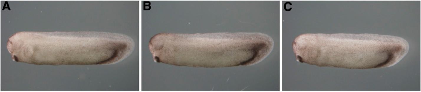 Fig. S7. Overexpression of nuclear DBF2-related 1 (NDR1) and NDR2. (A) Control (stage 33). (B) Overexpression of NDR1 (1 ng/blastomere) into ventral blastomeres of four-cell embryos had no effect on axis formation (n = 60). (C) Ventral overexpression of NDR2 (1 ng/blastomere) at the four-cell embryo stage also had no effect on axis formation (n = 60).