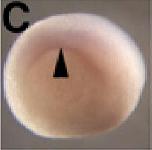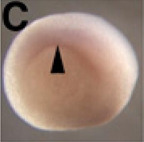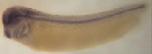 fry (FRYmicrotubule binding protein ) gene expression in bisected Xenopus laevis embryo, mid-sagittal section, assayed via in situ hybridization, NF stage 12, dorsal left, animal pole up.
