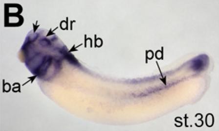 crabp2 () gene expression in X. during organogenesis. In situ hybridisation of crabp2, dark blue stain indicates expression. Stage 30. |