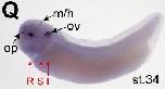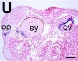 Raldh3 expression in stage 34 embryo, red arrows indicate relative positions of transverse sections in panels RâT. (Qâ) Detail of head of embryo shown in panel Q. Abbreviations: di, diencephalon; cf, choroid fissure; dr, dorsal retina; e, endoderm; ey, eye; hb, hindbrain; hy, hypophysis; le, lens; ll, lateral line precursors; lpm, lateral plate mesoderm; m/h, midbrain hindbrain boundary; no, notochord; nt, neural tube; op, olfactory placode; ov, otic vesicle; pk, pronephritic kidney; pd, pronephritic duct; re, retina; rp, roof plate; s, somite; te, telencephalon. Scale bars are 100 μM. |