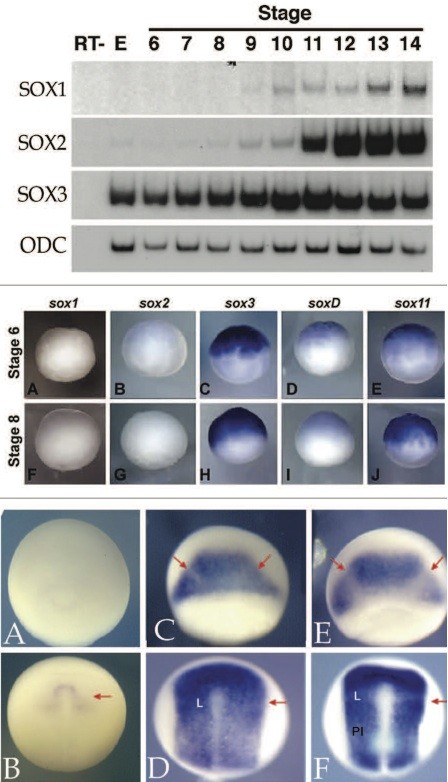 Figure 5. Displays the pattern of expression of B1-type Sox-type transcription factors in the early Xenopus embryo. Top: RT-PCR analysis at various embryonic stage; Center: in situ analysis at blastula stages; Bottom: in situ hybridization at early neurual stages (stage 13 and 15) for Sox1 (A and B), Sox2 (C and D) and Sox3 (E and F). Red arrow points to region of reduced Sox expression within the nascent neural plate (Grammer T, Zhang C, Klymkowsky MW, previously unpublished observations). Image copyrighted by PUBMED CENTRAL: PMCID: PMC3011258 |