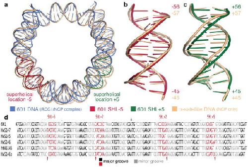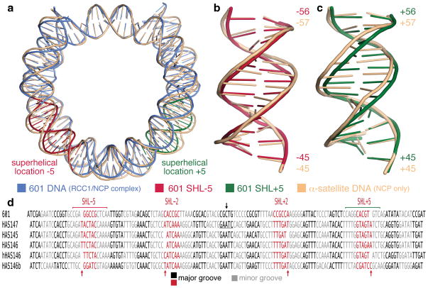 Figure 4. The Widom 601 sequence forms a 145 bp nucleosome core particle. (a) Superposition of 601 nucleosome core particle DNA (in blue) and human αsatellite nucleosome core particle DNA (peach) in simplified cartoon representation. The major differences between the two DNA structures at SHL +5 and −5 are highlighted in red and green respectively. (b) and (c) Superpositions of the two DNA structures at SHL +5 and −5 respectively. Numbers shown are the base positions from the nucleosome dyad. (d) Alignment of DNA present in nucleosome core particle crystal structures shows 5 bp major and minor grooves blocks. The 5 or 6 bp major groove blocks at SHL ±2 and ±5 accommodates differences in the DNA structures (red arrows). DNA dyad indicated by black arrow. Human α-satellite sequence alignments based on Fig.1 of Ong et al13.