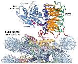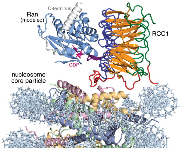 Figure 5. Model for Ran-RCC1-nucleosome core particle complex assuming no conformational changes. Ran (light blue) was modeled by aligning the RCC1 component of the Ran-RCC1 complex crystal structure (PDB id 1I2M) with one of the RCC1 subunits in the RCC1-nucleosome core particle structure. The flexible C-terminus of Ran is shown in white. The GDP nucleotide (magenta) was modeled using the nucleotide present in the RanGDP structure (PDB id 3GJ0). If Ran interacts with histones in the Ran-RCC1-nucleosome complex, a conformational change in either RCC1 or Ran presumably must occur.