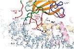 Figure 3. RCC1-nucleosomal DNA interactions. RCC1’s N-terminal tail approaches the DNA minor groove at superhelical location (SHL) 6.5, while its DNA-binding and adjacent loop binds across the major groove at SHL 6. Hydrogen bonds (<3.2 Å) are shown as yellow dotted lines, while potential hydrogen bonds are shown in blue.