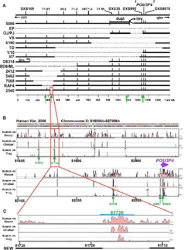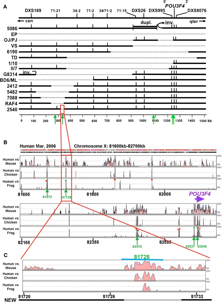 Fig. 1. Localization of DFN3 deletions and HCNRs in the upstream genomic region of POU3F4. Green arrows show the position of the identified enhancers. a Deletion map within 1.5 Mb around POU3F4 as reported previously (de Kok et al. 1996; Cremers et al. 2008). Dashed lines represent the deleted regions in each patient. The red box marks the 13-kb EcoRI fragment in which the 2540 8-kb deletion is located. b Vista view showing the distribution of HCNRs within 1-Mb upstream of POU3F4. Shown from top to bottom are mouse versus human, chicken versus human and Xenopus tropicalis versus human global alignments. Coloured peaks (purple coding, pink non-coding) indicate regions of at least 100 bp and 75% similarity. Red dots are HCNRs with no enhancer activity in Xenopus assays. Green arrows point at the HCNRs that showed enhancer activity (also shown with green dots). Their genomic positions are depicted in green. The red box marks the 13-kb EcoRI fragment in which the 2540 8-kb deletion is located. c Close-up of this 13-kb EcoRI fragment. Below is shown the new deletion identified in this work (dotted line). The blue line shows the region that was reported to have inner ear enhancer activity in mouse transgenic assays (Ahn et al. 2009)