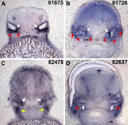 Fig. 3. Transverse sections at the level of the otic vesicle of 65â75 hpf embryos showing the expression patterns promoted by the different Pou3f4 HCNRs in stable zebrafish transgenic lines. All panels show in situs hybridization to detect EGFP mRNA in fixed embryos from the different transgenic lines. Note that enhancers at positions 81675 (a), 81728 (b) and 82637 (d) promoted expression, although in somehow different areas, in the periotic mesenchyme (red arrows). In addition, all enhancers are active in the otic epithelium (white arrows) and enhancer 82478 (c) is, in addition, active in the developing kidneys (yellow arrows)