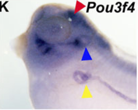 Fig. 2. Expression patterns promoted by different Pou3f4 HCNRs in Xenopus and zebrafish transgenic assays. Xenopus embryos show in situ hybridization to detect EGFP mRNA in fixed transgenic animals while zebrafish embryos show EGFP in living transgenic specimens. All panels, except (l) that show a dorsal view, are lateral views of transgenic Xenopus (a, c, e, g, i) at stage 35 or transgenic zebrafish (b, d, f, h, j, l) at 36â72-h post fertilization (hpf). The position of the HCNRs in the human genome is shown in the upper right corner of each panel. Different tissues are pointed at with coloured arrowheads. Blue otic vesicle, red midbrain, orange hindbrain, yellow kidney and purple pancreas. Note the equivalent patterns promoted by each HCNR in Xenopus and zebrafish transgenic embryos. k Expression pattern of XenopusPou3f4