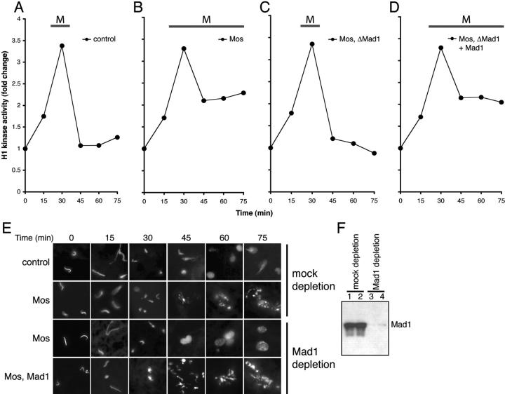 In cells containing disrupted spindles, the spindle assembly checkpoint arrests the cell cycle in metaphase. The budding uninhibited by benzimidazole (Bub) 1, mitotic arrest-deficient (Mad) 1, and Mad2 proteins promote this checkpoint through sustained inhibition of the anaphase-promoting complex/cyclosome. Vertebrate oocytes undergoing meiotic maturation arrest in metaphase of meiosis II due to a cytoplasmic activity termed cytostatic factor (CSF), which appears not to be regulated by spindle dynamics. Here, we show that microinjection of Mad1 or Mad2 protein into early Xenopus laevis embryos causes metaphase arrest like that caused by Mos. Microinjection of antibodies to either Mad1 or Mad2 into maturing oocytes blocks the establishment of CSF arrest in meiosis II, and immunodepletion of either protein blocked the establishment of CSF arrest by Mos in egg extracts. A Mad2 mutant unable to oligomerize (Mad2 R133A) did not cause cell cycle arrest in blastomeres or in egg extracts. Once CSF arrest has been established, maintenance of metaphase arrest requires Mad1, but not Mad2 or Bub1. These results suggest a model in which CSF arrest by Mos is mediated by the Mad1 and Mad2 proteins in a manner distinct from the spindle checkpoint.