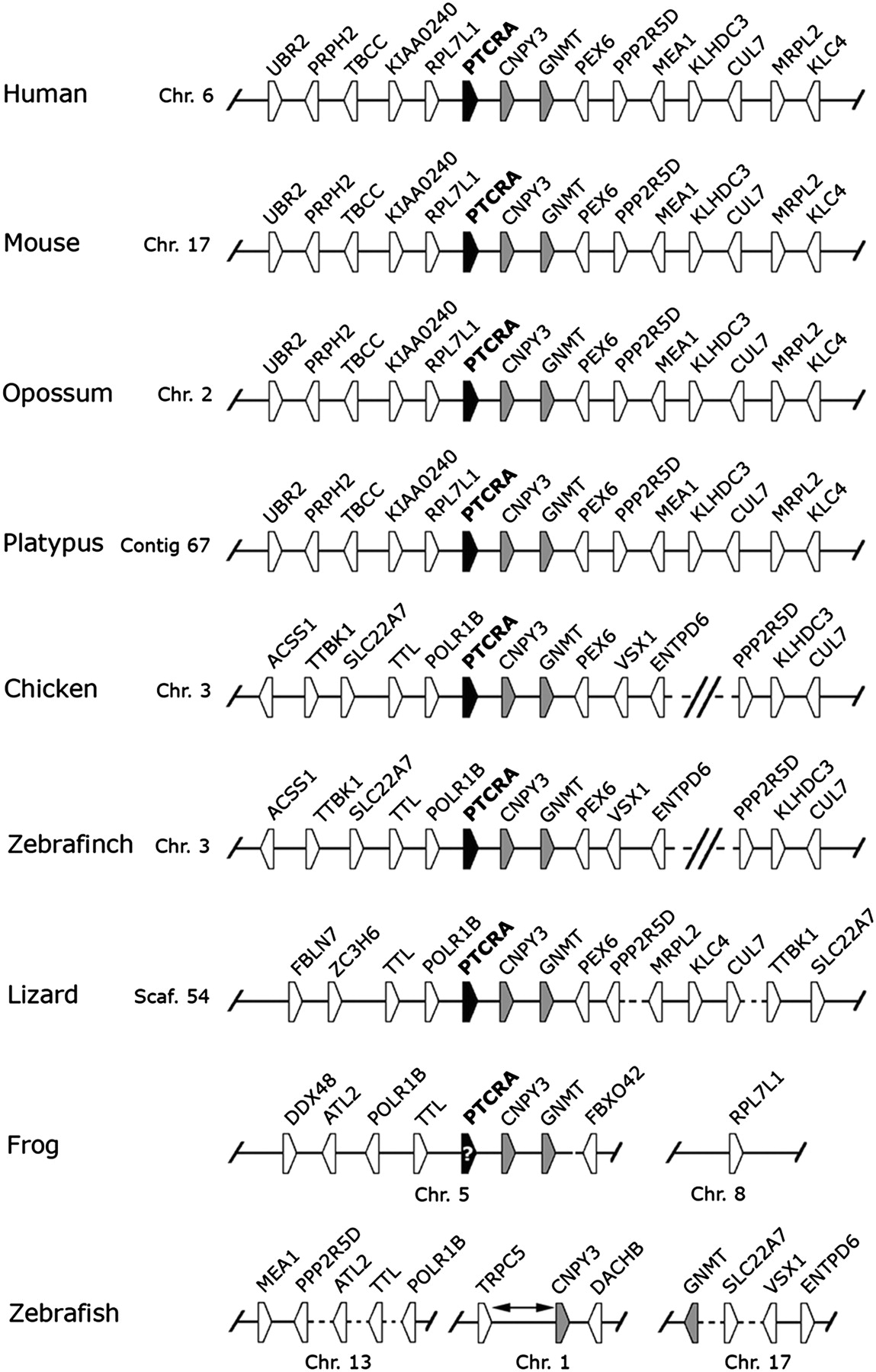 In humans and mice, the early development of αβ T cells is controlled by the pre-T-cell receptor α chain (pTα) that is covalently associated with the T-cell receptor β (TCRβ) chain to form the pre-T-cell receptor (pre-TCR) at the thymocyte surface. Pre-TCR functions in a ligand-independent manner through self-oligomerization mediated by pTα. Using in silico and gene synteny-based approaches, we identified the pTα gene (PTCRA) in four sauropsid (three birds and one reptile) genomes. We also identified 25 mammalian PTCRA sequences now covering all mammalian lineages. Gene synteny around PTCRA is remarkably conserved in mammals but differences upstream of PTCRA in sauropsids suggest chromosomal rearrangements. PTCRA organization is highly similar in sauropsids and mammals. However, comparative analyses of the pTα functional domains indicate that sauropsids, monotremes, marsupials, and lagomorphs display a short pTα cytoplasmic tail and lack most residues shown to be critical for human and murine pre-TCR self-oligomerization. Chicken PTCRA transcripts similar to those in mammals were detected in immature double-negative and double-positive thymocytes. These findings give clues about the evolution of this key molecule in amniotes and suggest that the ancestral function of pTα was exclusively to enable expression of the TCRβ chain at the thymocyte surface and to allow binding of pre-TCR to the CD3 complex. Together, our data provide arguments for revisiting the current model of pTα signaling.