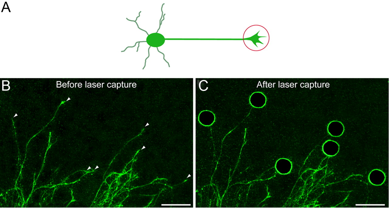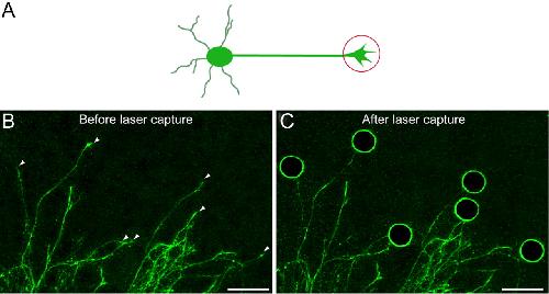 Figure 1. LCM of retinal growth cones. A , Schematic representation of an RGC showing the growth cone selected for LCM at 10à magnification. Before ( B ) and after ( C ) LCM micrographs of FM1-43 labeled Xenopus stage 32 retinal growth cones cultured on PET membrane slides. Scale bar, 150 μm.