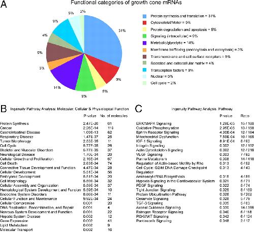Microarray and IPA of growth cone transcripts. A , Xenopus stage 32 growth cone mRNAs identified by microarray analysis were manually classified into different functional categories based on NCBI Gene tool. In total, 958 transcripts were identified, of which 444 have a known function. The pie chart represents the classification of these 444 mRNAs. B , IPA reveals the top 20 most enriched biological functions represented by the 444 growth cone mRNAs. p < 0.05. C , Table of significant biological pathways involving growth cone mRNAs generated by IPA.