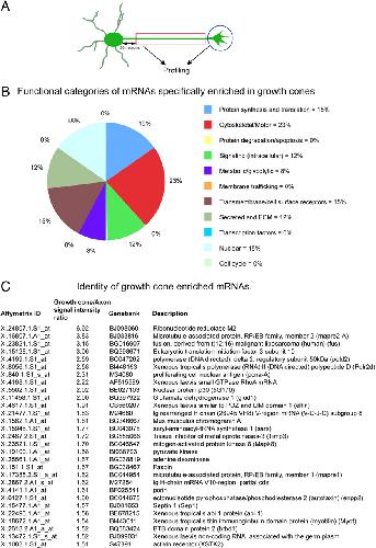 Comparative subcellular profiling reveals mRNAs enriched in growth cone. A , Schematic showing the two axonal subcompartments selected for LCM (axon shaft and growth cone). B , Assignment of the known annotated growth cone enriched mRNAs according to biological functional categories represented by pie chart. The cytoskeletal category is the major functional category of growth cone enriched mRNAs. C , List of known annotated genes that were at least 1.5-fold (GC/axon signal intensity ratio) enriched in Xenopus growth cones with respect to axons.
