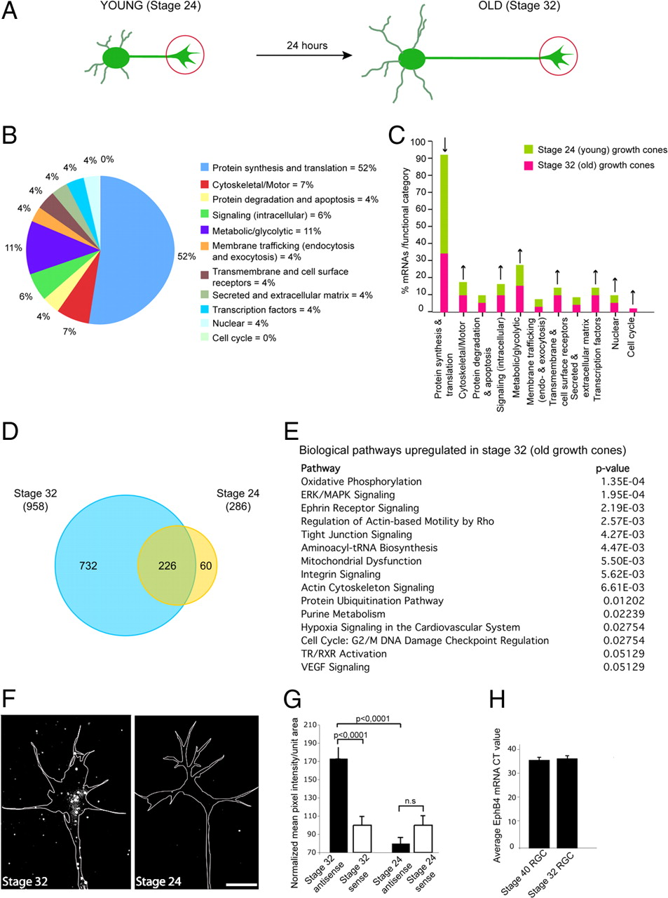 Figure 5. Growth cone mRNA repertoire is developmentally regulated: transcript number and complexity increases in 24 h. A , Schematic showing LCM collection of young stage 24 and old stage 32 growth cones. B , mRNAs identified in stage 24 growth cones were manually classified into different functional categories using NCBI Gene tool. In total, 286 mRNAs were identified of which 171 transcripts have a known function. The pie chart represents the functional classification of these 171 mRNAs. C , Comparison of functional classes of mRNAs between old (Fig. 2 A) and young ( B ) growth cones shows that most categories of mRNAs are upregulated with age (upward arrow), except for transcripts involved in protein synthesis and translation, demonstrating the increasing complexity of the growth cone mRNA pool with development. D , Comparative profiling shows that young growth cones have far fewer mRNAs than old growth cones (286 vs 958) and that the degree of overlap is â¼80%. E , IPA identified pathways that are specifically upregulated in stage 32 old versus stage 24 young growth cones. F , EphB4 mRNA localization in stage 32 growth cones was confirmed by fluorescence in situ hybridization. G , The specificity of the fluorescence signal was calculated by the mean pixel (fluorescence) intensity/unit area of antisense signal compared with its corresponding sense signal (n = 3 for each group). Statistical analysis performed using the KruskalâWallis test. Scale bar, 5 μm. H , Q-PCR results for EphB4 mRNA in LCM-isolated RGC cell bodies of old (stage 40) and young (stage 32) retina indicating similar expression levels at both developmental stages (n = 4 for each stage).