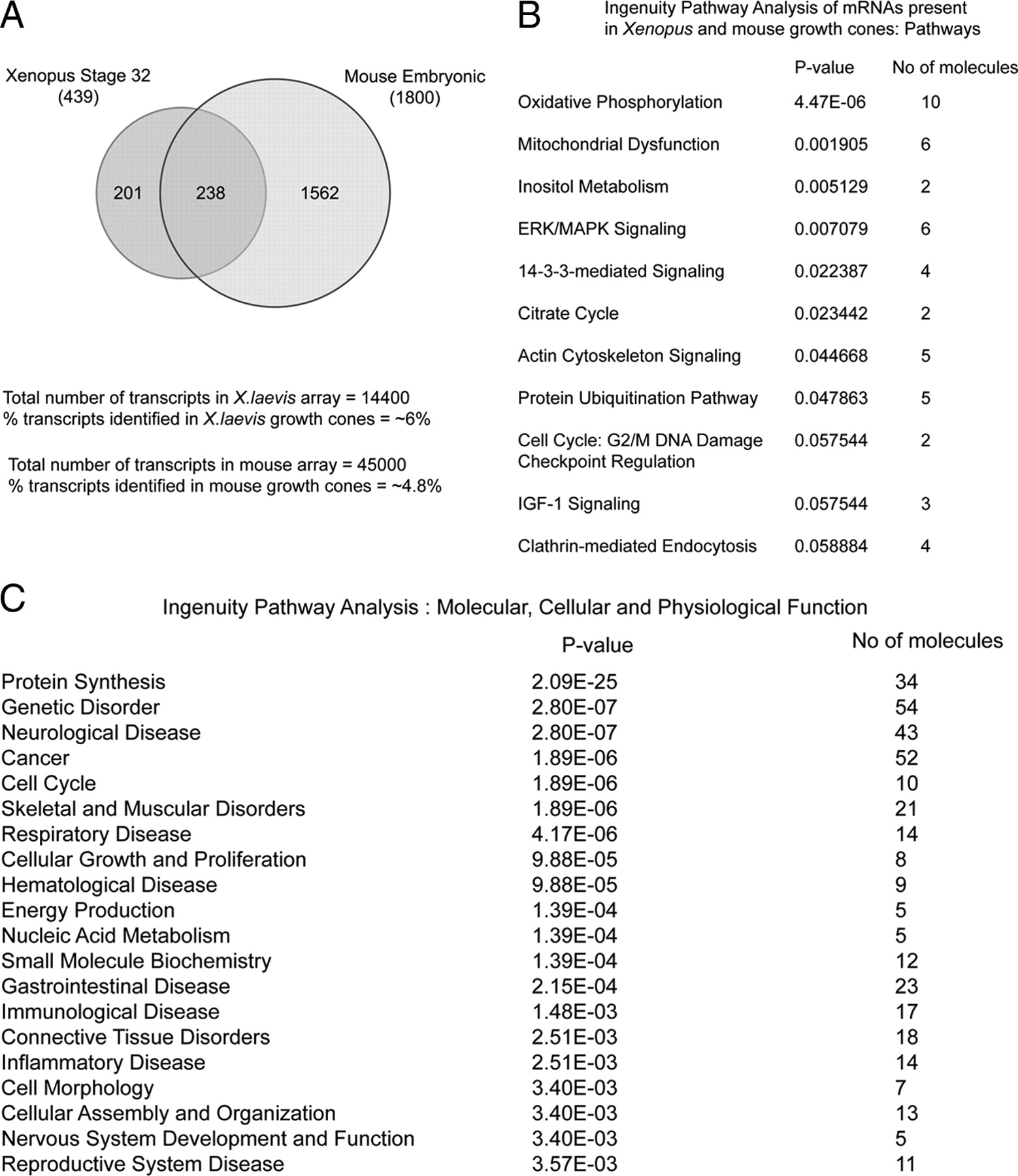 Mouse and Xenopus RGC growth cone mRNA profiles show conserved functional pathways. A , A Venn diagram showing 54% overlap in the transcript profiles of E16 mouse versus stage 32 Xenopus RGC growth cone mRNA. B , IPA reveals the most enriched biological pathways, such as oxidative phosphorylation (p < 0.05) and the number of mRNAs identified for each pathway common in both species. C , IPA identifies protein synthesis as the most enriched functional category among others common in both species (p < 0.05).