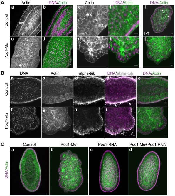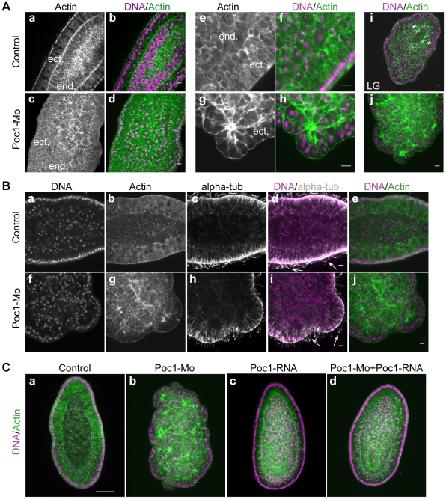 Figure 6. Poc1-MO disrupts gastrulation but not ciliogenesis.A. Confocal images of planula-stage embryos fixed one day after fertilization showing nuclear DNA labeled with Hoechst dye (purple in overlay) and actin with rhodamine-phalloidin (green in overlay). Poc1-MO at 2 mM (c,d) had little effect on the morphology of the ectoderm (ect), but cells in the endoderm were noticeably larger than in uninjected controls (a,b) and failed to organize into an epithelial layer. Following injection of Poc1-MO at 3 mM, the ectodermal layer was also found to be thickened compared to uninjected controls observed at the same time (e–f) and the cells organized in distinctive cell “rosettes” joined by strong basal actin bunches (g–h). The ectodermal organization in Poc1-MO embryos (h) closely resembled that of un-ingressed ectoderm cells (stars) in uninjected control embryos (g) at the late gastrula (LG) stage, consistent with the delay in gastrulation observed in time-lapse experiments. B. Confocal images of one-day planula–stage embryos stained with Hoechst dye (purple in overlay), rhodamine-phalloidin (green in overlay) and anti-alpha-tubulin to visualize microtubules including cilia (white in overlay, arrows). Pre-injection of 3 mM Poc1-MO (bottom row of images) caused severe disruption of morphology but did not prevent cilia growth on the ectodermal cells. C. Confocal images of one-day planula–stage embryos stained as in A, comparing uninjected embryos (a) with ones pre-injected with Poc1-MO (b), Poc1-mRNA alone (c) or Poc1-MO followed by Poc1-mRNA (d). The defects caused by Poc1-MO were abolished by subsequent mRNA injection, demonstrating specificity of phenotype. Poc1-mRNA alone had no major effect on cell or embryo morphology. Scale bar: 50 µm. |