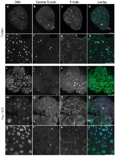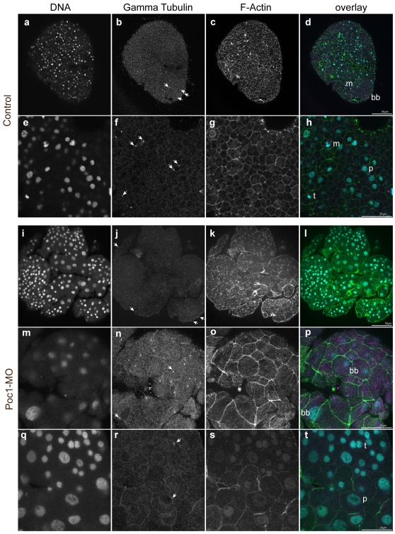 Figure 7. Centrosomes in Poc1-MO embryos.Confocal images of early gastrula-stage embryos stained with Hoechst dye for DNA (a, e, i, m, q), anti-gamma tubulin immunofluorescence (b, f, j, n, r) and Alexa-488-phalloidin for cortically-enriched F actin. In the overlays (d, h, l, p, t) DNA is blue, gamma tubulin purple and F-actin green. Control uninjected embryos (a–h) showed bright gamma tubulin dots (arrows) at the basal bodies of ectodermal cells (bb) and centrosomes of cells undergoing mitosis (prophase: p; metaphase: m; telophase: t). In embryos derived from Poc1-MO eggs (i–t), the size of the cells and the shape of many nuclei were irregular, indicating cell cycle disruption, however regular basal bodies (bb) remained clearly detectable in confocal sections through the apical ectoderm (m–p), and cells undergoing normal mitosis each with two gamma tubulin-rich centrosomes were detectable in deeper confocal planes (q–t). |