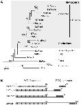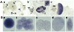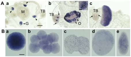 Figure 2. Expression of Clytia Poc1.A. Poc1 mRNA detected by in situ hybridization in adult Clytia medusae. a: Immature female. b: Mature female gonad showing high Poc1 mRNA concentrations in small and medium sized oocytes (inset shows an individual oocyte at higher magnification, with black arrowheads indicating the particulate distribution of the probe around the oocyte nucleus. Scale bar: 50 µm). c: Mature male gonad. Poc1 is expressed strongly in male and female gonads, and weakly at the base of the tentacle bulb (arrows in b and c). G = gonad; M = manubrium; TB = tentacle bulb; O = oocytes; gv = germinal vesicle. Asterisks in b indicate non-specific staining of the tentacle bulb endoderm, frequently observed in Clytia in situs [1]. Scale bar: 100 µm. B. Poc1 mRNA detected by in situ hybridization of eggs, embryos and larvae. Poc1 maternal mRNA is detected strongly in the unfertilized egg (a) but decreases progressively through cleavage (b: 8-cell stage) and blastula (c) stages. The relatively higher signal in gastrula (d) and planula (e) stages probably reflects new trancription starting from the blastula stage. Scale bar: 50 µm. |