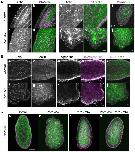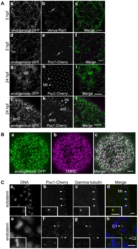 Figure 3. Clytia Poc1 is targeted to centrioles.Confocal images of embryos expressing fluorescent–tagged ChePoc1 protein following microinjection of mRNA constructs into the egg prior to fertilization. A. blastulae fixed at 5hpf (a–f) and planula larvae fixed at 24hpf (g,i: plane through apical ectoderm; j,k,l: plane through both endoderm (end) and ectoderm (ect)). Both fluorescent Poc1 proteins clearly localize to punctate aggregates positioned on the apical side of each ciliated ectoderm cell of the larva (bb/arrowheads: basal bodies), and randomly in blastula cells and larval endoderm (arrows). a,d,g,j: endogenous GFP showing the distribution of mitochondria in the cytoplasm of each cell (see B); b: Venus-Poc1; e,h,k: Poc1-mCherry; c,f,i,j: merged images. Scale bar: 10 µm. B. Confocal images of an unfertilized egg demonstrating that maternal endogenous Clytia GFP (a) is a natural mitochondrial marker, colocalizing with the mitochondrial dye TMRE (b) as seen in the merged image (c). C. Confocal images of larval cells expressing Poc1-mCherry following micro-injection of mRNA constructs into the egg prior to fertilization, fixed, and then processed for immunofluorescence with anti-gamma tubulin to locate centrosomes. Poc1-mCherry colocalizes with gamma-tubulin at the position of the basal body (bb/arrowheads- enlarged in insert) in ectoderm cells (a,b,c,d) and at the centrosomes of dividing cells in the endoderm (e,f,g,h) (C1/C2 = centrosomes close to prometaphase chromatin; metaphase cell in inset). a,e: DNA (Hoechst); b,f: Poc1-Cherry; c,g: gamma tubulin; d,h: merge (blue = DNA; red = Poc1-Cherry; green = gamma tubulin). Scale bars: 5 µm. |