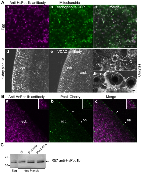 Figure 4. An Anti-Human Poc1 antibody recognizes mitochondria but not Clytia Poc1.A. HsPoc1 immunofluorescence (a,d,f) staining (mixed R56 and R57 antibodies) compared In spawned eggs (a–c), HsPoc1 co-localized with the mitochondria-targeted endogenous maternal GFP2 (b), while in larvae (d,e) it strongly resembled staining performed in parallel with rabit anti-VDAC antibody (e: ect. = ectoderm; end. = endoderm) and in oocytes (O) in live ovary pieces (f–g) with TMRE staining (g). Scale bars: 10 µm. B. HsPoc1 antibodies R56 and R57 (a) do not colocalize by immunofluorescence with Poc1-mCherry expressed protein (b) at ectodermal (ect) basal bodies (bb) in fixed planula larvae. In the merged images (c) the Poc1 antibody staining is shown in purple and Poc1-mCherry in green. Scale bar: 10 µm. Insets show enlarged basal bodies. Scale bar: 5 µm. C. Western blot probed with the Anti-HsPoc1b R57 antibody of groups of ten Clytia eggs or 1 with mitochondrial markers. 1-day planula larvae harvested after injection of 3 mM Poc1-MO and/or 1 µg/µl Poc1-RNA. Arrows indicate mayor and minor bands recognized by the antibody. The detected proteins are not depleted in the Poc1-MO extracts, nor enhanced in the ChePoc1 over-expressed extracts. |