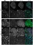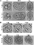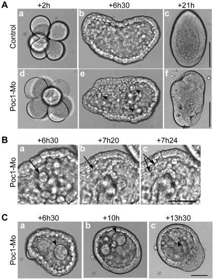Figure 5. Poc1 MO disrupts cell division.Images from time-lapse recordings of Clytia embryos injected with Poc1-MO before fertilization (Movie S1). Times post fertilization are indicated. A. Cleavage divisions in Poc1-MO embryos proceeded in line with uninjected controls (a,d). Starting from around 6 hours post fertilization (blastula stage: b,e), Poc1-MO embryos showed lengthening of the cell cycle in some cells, followed by cell division defects/arrest, resulting in the appearance of larger cells (arrowheads). The accumulation of large cells in the blastocoel contributed to disruption and delay of gastrulation, resulting in characteristically deformed planula larvae (c,f). B. Cell cycle lengthening in a Poc1-MO blastula. Arrows identify a cell already larger than those around it cell which remains un-divided for at least 50 minutes (between a and b) before dividing (c). In uninjected controls filmed in parallel, cell division was largely synchronous until the blastula stage, with division occuring every 30 minutes (Movie S1, Figure 5A). C. Accumulation of abnormally large cells (arrowheads) in the blastocoel cavity (a), which remained undivided during gastrulation (b, c). Scale bars: 100 µm. Times indicated are hours post fertilization at 18°C. |