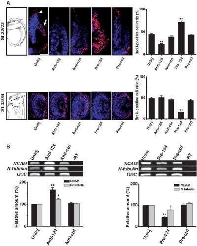 Figure 1. MiR-124 regulates cell proliferation and neurogenesis in the optic vesicle and forebrain. (A) Proliferating cells were detected with a BrdU (red) incorporation assay. Hoechst (blue) was applied to label the nuclei of all cells. The dashed line in the schematic diagram [images from Nieuwkoop and Faber, 1994, Normal Table of Xenopus laevis (Daudin)] indicates the location of the transverse sections in the developing eye. In the optic vesicle (arrow) and forebrain (arrow head) of embryos at stage (st.) 22/23, the BrdU-positive cell ratio was significantly reduced when a miR-124 inhibitor (Anti-124) was injected, but significantly increased when an miR-124 precursor (Pre-124) was applied. In the optic cup (st.33/34), injection of either control inhibitor (Anti-ctrl) or precursor (Pre-ctrl) molecules gave no significant change in cell proliferation compared with the uninjected control (Uninj). The bar graph illustrates the BrdU-positive ratio of the transverse sections (mean ± SEM, 24 sections from six embryos). Scale bar: 100 μm. (B) Expression of NCAM and N-tubulin are significantly upregulated with downregulation of miR-124, but significantly downregulated with overexpression of miR-124. ODC and –RT are the internal and negative controls, respectively, for the RT–PCR procedure. The bar graph illustrates the gene expression level analyzed by real-time RT–PCR. Means ± SEM are from three independent experiments. The values of injected groups were compared with those of uninjected controls by one-way ANOVA followed by the Duncan test. *P and #P < 0.05; **P and ##P < 0.01.