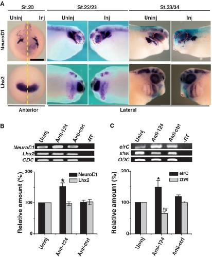 Figure 2. Downregulation of miR-124 increases the expression of NeuroD1 in the optic vesicle. (A) Expression of NeuroD1 increased in stages 20 and 22/23 embryos but not in stages 33/34 embryos injected (Inj.) with Anti-124, as indicated by in situ hybridization, while expression of Lhx2 was not affected at any of these stages. Yellow dashed lines indicate the midlines of Stage 20 embryos. Red dots circle the position of the optic vesicle/cup. Scale bar: 500 μm. (B) RT–PCR and real-time PCR quantification confirm that expression of NeuroD1, but not Lhx2, in stage 22/23 embryos is upregulated on loss of miR-124. (C) Correspondingly, the expression of erC increased and that of xtwi decreased. *P and #P < 0.05; **P and ##P < 0.01.