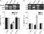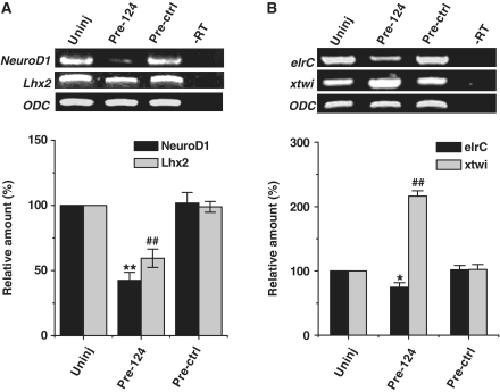 Figure 3. MiR-124 overexpression reduces the expression of NeuroD1. RT–PCR (gel panel) and real-time PCR (bar graph) conditions are the same as those in Figure 2. (A) Gain of miR-124 resulted in downregulation of both NeuroD1and Lhx2 at Stages 22/23. (B) Expression of elrC decreased and that of xtwi increased. *P and #P < 0.05; **P and ##P < 0.01.