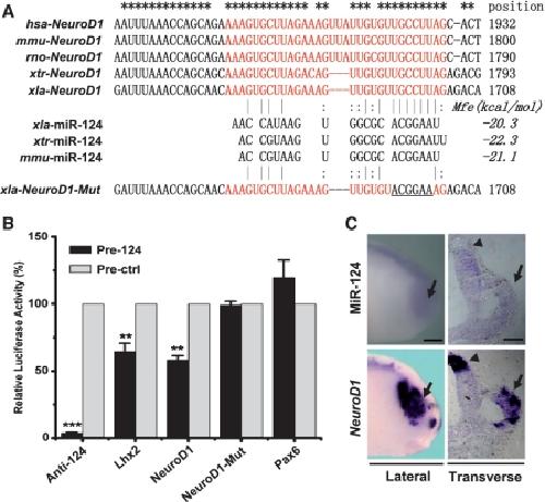 Figure 5. MiR-124 targets NeuroD1. (A) An evolutionarily conserved miR-124 target element (red) is located at the 3â²-UTR of NeuroD1 mRNAs in humans (hsa), mice (mmu), rats (rno), Xenopus tropicalis (xtr) and Xenopus laevis (xla). The minimal free energy (Mfe) of xla-NeuroD1 pairing to xla-miR-124, xtr-miR-124 and mmu-miR-124 was below â20âkcal/mol. A mutant NeuroD1 plasmid (xla-NeuroD1-Mut) was constructed with mutations in the underlined positions which pair with the miR-124 seed sequence (2â7ânt). Homologous sites are marked by asterisks. (B) Luciferase assays were carried out in the 293T cell line using pCS2-Luc-NeuroD1 3â²-UTR reporters (in xla). Positive (Anti-miR-124, Lhx2) and negative (Pax6, NeuroD1-Mut) controls were set. Anti-miR-124 almost completely blocks luciferase activity. The relative luciferase activity of the NeuroD1 group is significantly lower than that of the negative control groups and similar to that of the Lhx2 positive control. Meansâ±âSD are from three independent experiments. *Pâ<â0.05; **Pâ<â0.01; ***Pâ<â0.001. (C) In situ hybridization of miR-124 and NeuroD1 at stage 22/23. MiR-124 is weakly expressed in the eye (arrow) in comparison with expression of NeuroD1 as shown in the lateral view. Transverse sections at the level of the eye showed that the expression patterns of miR-124 and NeuroD1 were partially complementary in the forebrain (arrow head) and optic vesicle (arrow).