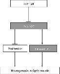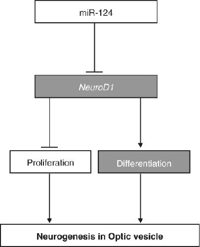 Figure 6. A putative scheme of the regulatory effect of miR-124 on NeuroD1 in early eye and brain development. NeuroD1, which represses cell proliferation and promotes neuronal differentiation, is one of the target genes of miR-124. The arrow represents promotion; the right angle represents repression.