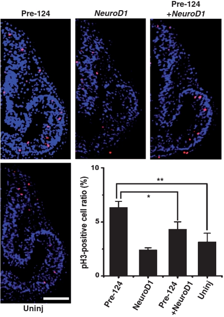 Figure 4. NeuroD1 antagonizes miR-124-induced cell proliferation. Transverse sections of the optic vesicle in stage 22/23 embryos injected with Pre-124 (0.025 pmol) and/or NeuroD1 (10 pg). Proliferzating cells were immunohistochemically stained with phosphohistone-H3 (pH3) antibody (red). Nuclei were labeled with Hoechst33 258 (blue). The pH3-positive cell ratio of transverse sections was shown in the bar graph (Mean ± SEM, 16 sections from four embryos). More proliferating cells in the brain and optic vesicle were detected in the Pre-124 group compared with the uninjected blank control. Injection of NeuroD1 mRNA alone had no obvious effect on cell proliferation. Co-injection with Pre-124 plus NeuroD1 restored cell proliferation to the level of the blank control. Scale bar: 100 μm. *P < 0.05; **P < 0.01.