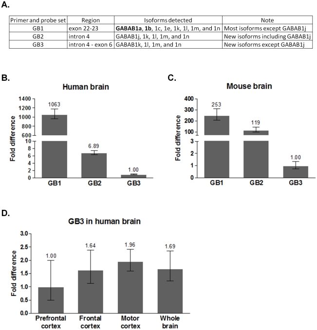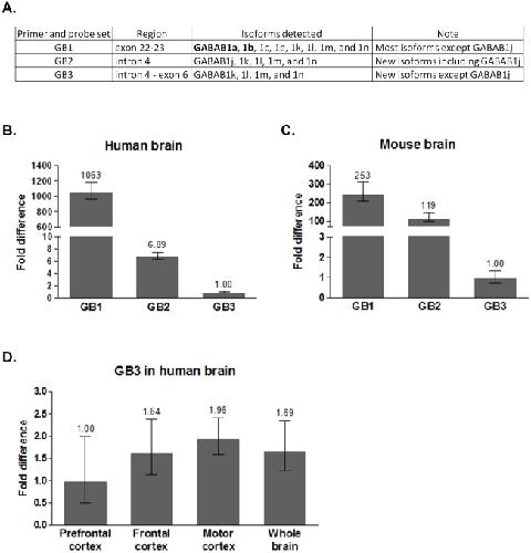 Figure 4. The expression of GABAB1 isoforms.A. For quantitative real-time PCR, primer and probe sets were designed from human and mouse. GB1 sets were designed by the last two exons, exon 22 and 23, and were used for detecting most known GABAB1 isoforms except GABAB1j. They also represented the microarray probes that aligned to 5′ exons of GABAB1 gene. GB2 sets were for detection of GABAB1j, k, l, m, and n. They aligned to intron 4 and designed for human cDNA microarray probe, clone 300899, and its mouse homologous probes. GB3 sets targeted intron 4 through exon 6 and were specific for GABAB1k, l, m, and n. B. In human brain, GB1 showed much more dominant expression than GB2 and GB3. C. GB1 expression was also stronger than GB2 and GB3 in mouse brain. However, GB2 and GB3 expression levels in mouse brain were much higher than human brain if they were compared with GB1 expressions. D. In human, GB3 expressions were similar in prefrontal cortex, frontal cortex, and motor cortex. |