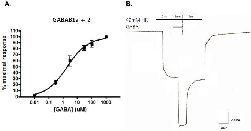 Figure 5. GABAB1a/2 concentration response curve.A. cDNA and cRNA double injections were performed. For cDNAs, both GABAB1a and GABAB2 were injected into the nucleus of Xenopus oocytes. GIRK1 and GIRK2 cRNAs were also injected into the cytosol of the same oocytes. Current response of GABAB receptor and GIRK expressing oocytes were measured by two-electrode voltage clamp. 1 mM GABA was the maximum response concentration; EC50 was 1.9 uM; Hill slope was 0.59. B. For GABAB1a/2 concentration response curve measurement, GABA dissolved in 49 mM HK was applied for 1 min following a 2 min 49 mM HK application. After 2 additional min of 49 mM HK application, a 20 min wash with ND96 was followed. |