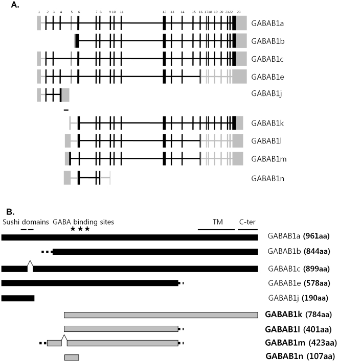 Figure 1. Schematic summary of GABAB1 isoforms.A. Introns and exons of known and novel GABAB1 isoforms were compared. The numbers listed at the top are exon numbers of GABAB1a. Blocks represent exons, and lines are introns of the GABAB1 gene. Black lines and blocks are ORFs, and grey lines and blocks are UTRs. Double line is cDNA microarray probe, clone 300899, which aligns to the intron 4 of GABAB1a. Human GABAB1a, b, c, e, and rat GABAB1j are previously identified isoforms. After cloning, the following novel isoforms were found in human: GABAB1k, GABAB1l, GABAB1m, and GABAB1n. Human GABAB1j was predicted. Mouse GABAB1j and GABAB1k were also cloned. GABAB1k contains the 3′ part of intron 4 through exon 23. GABAB1l has additional splicing out of exon 15, and GABAB1m has similar splicing patterns as GABAB1l except for additional splicing out at 5′ part of exon 6. GABAB1n has an SNP on exon 8. B. ORFs of GABAB1 isoforms are shown with important functional domains. Black bars are previously known isoforms, and grey bars represent novel isoforms. Dotted lines stand for unique sequence of each isoform. GABAB1k contains GABA binding sites, seven transmembrane domains, a G-protein coupling region, and a C-terminal intracellular region. GABAB1l and GABAB1m do not have transmembrane domains, a G-protein coupling region, or C-terminal intracellular regions (same as GABAB1e). GABAB1m has a longer N-terminal than GABAB1l. GABAB1n contains only a partial GABA binding site. |
