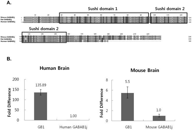 Figure 2. Sequences for human, mouse, and rat GABAB1j isoforms and relative expression levels.A. Sequence alignment of human, mouse, and rat GABAB1j showed a different C-terminal pattern in human GABAB1j. B. Human and mouse GABAB1j mRNA expression levels were measured with quantitative real-time PCR. GB1 primer and probe sets were used to detect most known major GABAB1 isoforms except GABAB1j. Human and mouse GABAB1j primer and probe sets were specific for only GABAB1j. GB1 expressions were shown as fold differences from human and mouse GABAB1j. Although a previous rat GABAB1j study indicated that GB1 and GABAB1j expression levels were similar, human and mouse GABAB1j expressions were lower than GB1. Mouse GABAB1j expression was 5.5 fold lower than GB1 expression, and human GABAB1j showed 135.89 fold lower expression. If the fold differences were compared, human GABAB1j expression level was much less (25 times) than mouse GABAB1j expression. Therefore, GABAB1j expressions vary across species. |