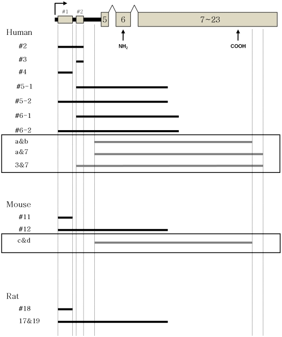 Figure 3. Strategy for cloning GABAB1k.The top figure represents exon-intron composition of the proposed GABAB1k. Numbered rectangular boxes represent known exons, and lines between boxes are introns. Two arrows on the bottom of the boxes represent ORF. Black bar is intron 4, and the two probe sequence data, NCBI accession numbers W07715 and N80593, are indicated as #1 and #2 above small rectangular boxes, respectively. They are 5′ and 3′ sequences of the microarray probe, clone 300899. A arrow above the black bar is a possible transcription initiation site. Horizontal lines indicate sequences detected after PCR. Based on microarray probe, clone 300899, the following clones were detected in human cultured cells, mouse midbrain, and rat hippocampus: #2, #3, #4, #11, and #18. From the previous microarray probe sequence analysis, the microarray probe aligned to intron 4 and was either 3′ or 5′ UTR of novel isoforms. Because there was no known human GABAB1 isoform that had intron 4 as an exon, the two possible isoform models, GABAB1j and GABAB1k, were proposed. The predicted GABAB1j and GAGAG1k contain intron 4 as 3′ or 5′ UTR, respectively. Because GABAB1j and GABAB1k are only two possible isoform models that contain clone 300899, #2, #3, #4, #11, and #18 can be partial GABAB1j or GABAB1k and show their existences. From the same RNA sources six different N-terminal partial clones, #5-1, #5-2, #6-1, #6-2, #12, and 17&19, indicated the existence of GABAB1k. They share common 5′ UTRs and partial N-terminal ORFs of GABAB1k and suggest that GABAB1k exists in human, mouse, and rat. To clone the full ORF of GABAB1k, additional primers were designed at its possible 3′ UTR region based on other known isoform sequence analyses. Full ORF containing clones were cloned from human brain and mouse midbrain. Bottom two boxes show clones which contain the full ORF (a&b, a&7, 3&7 in human and c&d in mouse). |