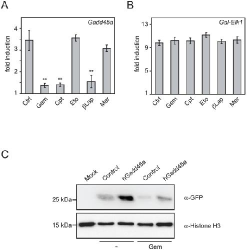 Figure 1. Gemcitabine inhibits Gadd45a mediated gene activation.(A–B) Luciferase reporter assays of HEK293T cells transiently transfected with HpaII in vitro methylated Gal-responsive reporter, together with either Gadd45a (A) or Gal-Elk1 (B, specificity control). Cells were treated with DMSO (control, Ctrl), gemcitabine (Gem), camptothecin (Cpt), etoposide (Eto), β-lapachone (βLap), merbarone (Mer) as indicated. Shown is the fold activation by Gadd45a (A) or Gal-Elk1 (B) over control transfected cells. Error bars represent standard deviation. Significance was assessed via unpaired Student's t-test using the control sample as reference: ** = p<0.01. (C) Western blot analysis of EGFP expression. Whole cell extracts of HEK293T cells transiently transfected with in vitro methylated pOctTK-EGFP reporter with Gadd45a or pBl-KS (control), with or without gemcitabine treatment as indicated.