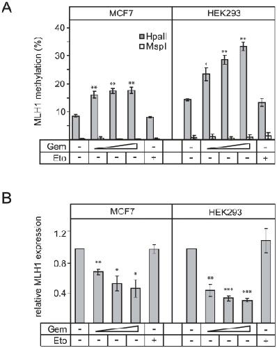 Figure 6. Gemcitabine induces hypermethylation and silencing of MLH1.(A) Methylation sensitive PCR analyzing MLH1 promoter methylation state in MCF7 or HEK293 cells. Cells were treated as indicated with increasing concentrations of gemcitabine (Gem, 33–134 nM) or etoposide (Eto, 43 nM) as control. HpaII restriction is methylation sensitive and allows the quantification of the MLH1 methylation state. As control, samples were also treated with the methylation insensitive isoschizomer MspI. Error bars represent the standard deviation of three biological replicates. Significance was assessed via unpaired Student's t-test using the untreated sample as reference: * = p<0.05; ** = p<0.01. (B) Cells were treated as in (A). Relative expression of MLH1 normalized to GAPDH was monitored by qPCR. Error bars represent the standard deviation of three biological replicates. Significance was assessed via unpaired Student's t-test using the untreated sample as reference: * = p<0.05; ** = p<0.01; *** = p<0.001.