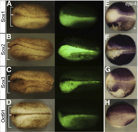 Fig. 1. Oct91 and Sox1 expand the neural tube and repress epidermal formation similarly to Sox2 and 3. (A) Bright field and fluorescent microscopy of stage 17 embryos injected with Sox1, Sox2, Sox3 or Oct91 and GFP mRNA into one cell of a two- cell stage embryo. (E) WISH for epi-k expression in embryos injected with soxB1 and LacZ, or oct91 and GFP mRNA. Asterisk in E marks the injected side. The injected sides of Sox1 (180/190), Sox2 (135/152), Sox3 (81/81) and Oct91 (49/53) have repressed epi-k expression compared to their uninjected side. All views are dorsal with anterior to the left. Brackets in A compare the relative width of the neural tube of the uninjected (top) to the injected side (bottom) |