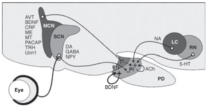 This review focuses on the plasticity of the regulation of a particular neuroendocrine transducer cell, the melanotrope cell in the pituitary pars intermedia of the amphibian Xenopus laevis. This cell type is a suitable model to study the relationship between various external regulatory inputs and the secretion of an adaptive endocrine message, in this case the release of α-melanophore-stimulating hormone, which activates skin melanophores to darken when the animal is placed on a dark background. Information about the environmental conditions is processed by various brain centres, in the hypothalamus and elsewhere, that eventually control the activity of the melanotrope cell regarding hormone production and secretion. The review discusses the roles of these hypothalamic and extrahypothalamic nuclei, their neurochemical messengers acting on the melanotrope, and the external stimuli they mediate to control melanotrope cell functioning.