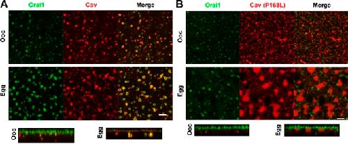 Figure 5. Cav is required for Orai1 internalization. (A) 10 ng GFP-Orai1– and mCherry-Cav–expressing oocytes and eggs. Images are ∼2-µm deep into the cell. Orthogonal sections are also shown. (B) GFP-Orai1 was allowed to express and traffic normally for 24 h followed by expression of 10 ng of the dominant-negative Cav mutant P168L 24 h before maturation. Bars, 5 µm. |