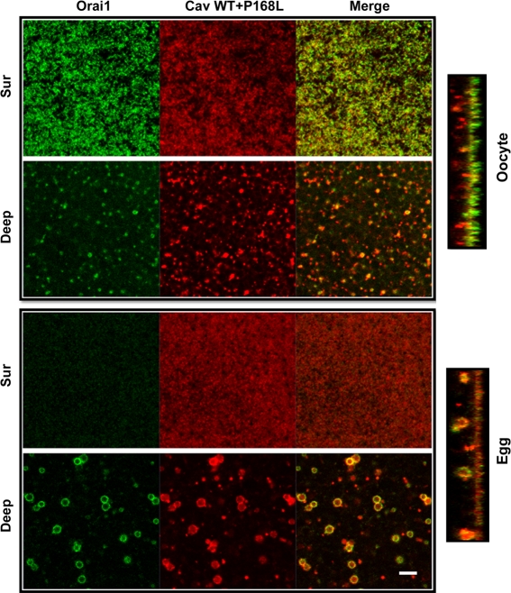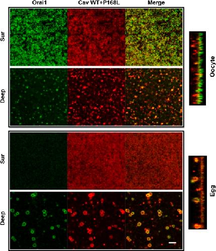 Figure 6. Wild-type Cav rescues Orai1 internalization inhibition with Cav P168L. Oocytes were injected with 2 ng GFP-Orai1, 10 ng Cherry-Cav (Ch-Cav) wild type (WT), and 10 ng Cherry-Cav-P168L, and then matured. Orthogonal sections and different focal plane images illustrate Orai1 and Cav distribution between the cell membrane (Sur) and endosomal compartment (Deep). Bar, 5 µm. |