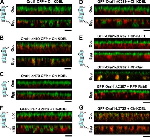 Figure 7. Domains involved in Orai1 trafficking. Orthogonal sections and cartoon representation for the different constructs as indicated. (A–C) Orai1 or N-terminal deletion mutants Orai1-ΔN90 and Orai1-ΔN70 tagged with CFP at the C terminus (5 ng RNA/cell) were coexpressed with Cherry-KDEL. (D) GFP-Orai1-ΔC289 (2 ng RNA/cell) is shown. (E) GFP-Orai1-ΔC267 alone or coexpressed with Cherry-Cav or RFP-Rab5. (F) GFP-Orai1-L282S traffics normally. (G) GFP-Orai1-L273S is trapped in the ER. Bars, 5 µm. |