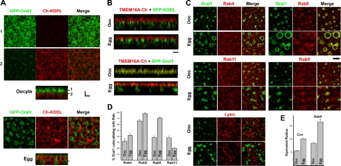 Figure 1. Orai1 subcellular distribution at rest and during meiosis. (A) Oocytes and eggs expressing GFP-Orai1 (2 ng RNA/cell) and the ER marker mCherry-KDEL (10 ng RNA/cell). Confocal images show two focal planes as indicated by the matching numbers (1 and 2) in the orthogonal section across the z-image stack. Bar, 3 µm. (B) Orthogonal sections from cells expressing 8 ng xTMEM16a-mCherry with either 5 ng GFP-KDEL or 2 ng GFP-Orai1. Bar, 3 µm. (C) Oocytes and eggs expressing GFP-Orai1 with endosome markers including RFP-Rab5, mCherry-tagged Rab4, Rab9, and Rab11 or stained with the lysosome marker LysoTracker. Bar, 5 µm. (D) Percentage of Orai1-positive pixels colocalizing with the Rabs (n = 10–15). (E) Equivalent endosome radius measured using MetaMorph (n = 9–13). Error bars indicate mean ± SEM. |