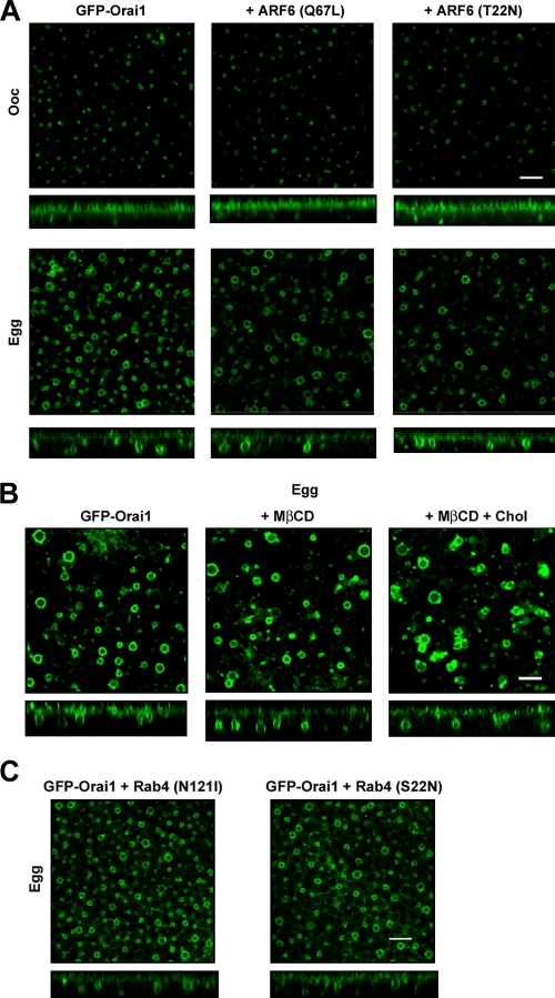 Figure 3. Orai1 internalization: ARF6, cholesterol, and Rab4. (A) Oocytes and eggs expressing 2 ng GFP-Orai1 alone or with 20 ng constitutively active ARF6 (Q67L) or 20 ng dominant-negative ARF6 (T22N). Orthogonal sections and deep-view images are shown. (A) GFP-Orai1–expressing oocytes were untreated, treated with 20 mM MβCD to deplete cholesterol, or treated with MβCD plus 5 mg/ml cholesterol for 9 h in Ringer, and then matured. (C) Orthogonal sections and deep-view images from eggs expressing 20 ng GFP-Orai1 and dominant-negative Rab4 mutants N121I or S22N. Bars, 5 µm. |