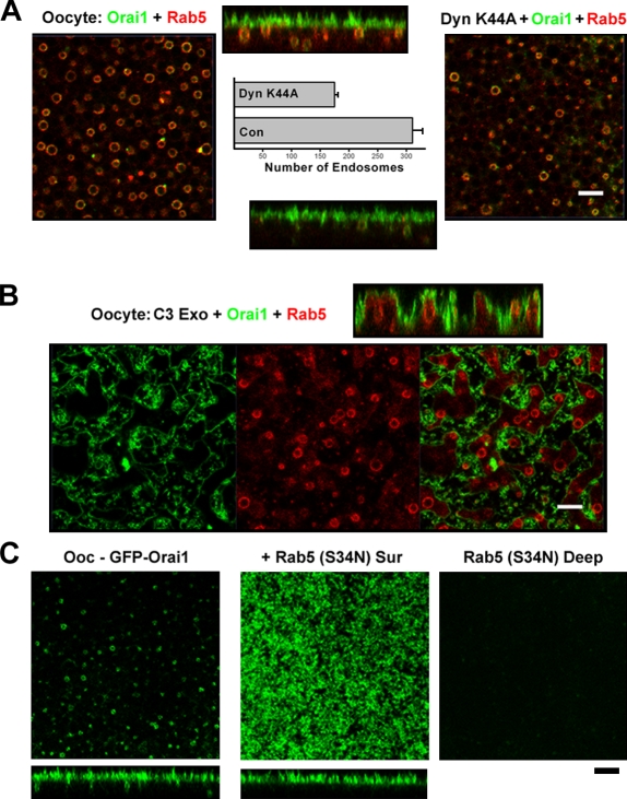 Figure 4. Orai1-recycling endocytic pathway. (A) Oocytes expressing 10 ng GFP-Orai1 and RFP-Rab5 were untreated or injected with dynamin (Dyn) K44A and allowed 24 h to express. Deep-view images and orthogonal sections are shown. The number of Rab5- and Orai1-positive endosomes was measured using MetaMorph (n = 9–19). Error bars indicate mean ± SEM. (B) C3 exoenzyme was injected into GFP-Orai1– and RFP-Rab5–expressing oocytes 2 h before imaging. (C) Images GFP-Orai1–injected or GFP-Orai1– and Rab5 (S34N)–coinjected oocytes. Bars, 5 µm. |