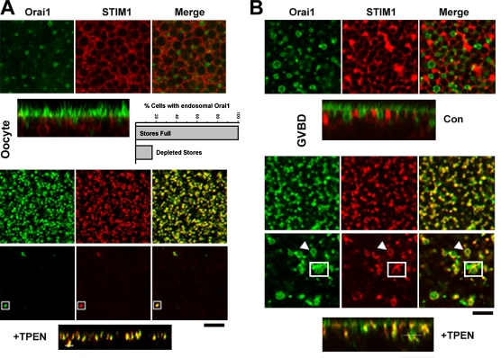 Figure 9. Endosomal Orai1 translocates to the cell membrane after store depletion. (A) Distribution of Orai1 and STIM1 in oocytes before and after store depletion with 5 mM TPEN, which results in coclustering of STIM1 and Orai1 at the plasma membrane–ER junction. In addition, rare coclustering events are detected deep in the cell (1.2 µm), as indicated by the boxes and matching white bar in the orthogonal section. Deep focal plane and orthogonal sections are shown. (B) Same experimental approach as in A except that images were taken at the GVBD stage of oocyte maturation. Store depletion (+TPEN) leads to Orai1–STIM1 coclustering at the cell membrane and deep in the cell at the endosome–ER interface (arrowheads and boxes). The position of the boxes is indicated by the bar in the orthogonal view. Bars, 5 µm. |