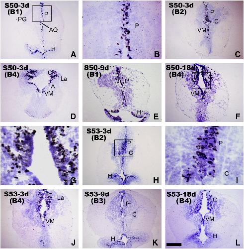 Labeling in the diencephalic auditory areas after the injections of [3H]-thymidine into tadpoles at S50 (A–G) or 53 (H–L). Tadpoles were allowed to survive for 3 d (A to D and H to G), 9 d (E and K), or 18 d (F and L). The boxed areas in A, F, and H are further magnified in the next image. The brain levels of the images located (B1 to B4) are shown in Fig. 1. Scale bar = 50 μm for B, G, I, and L and 200 μm for the others. For the abbreviations, see list.