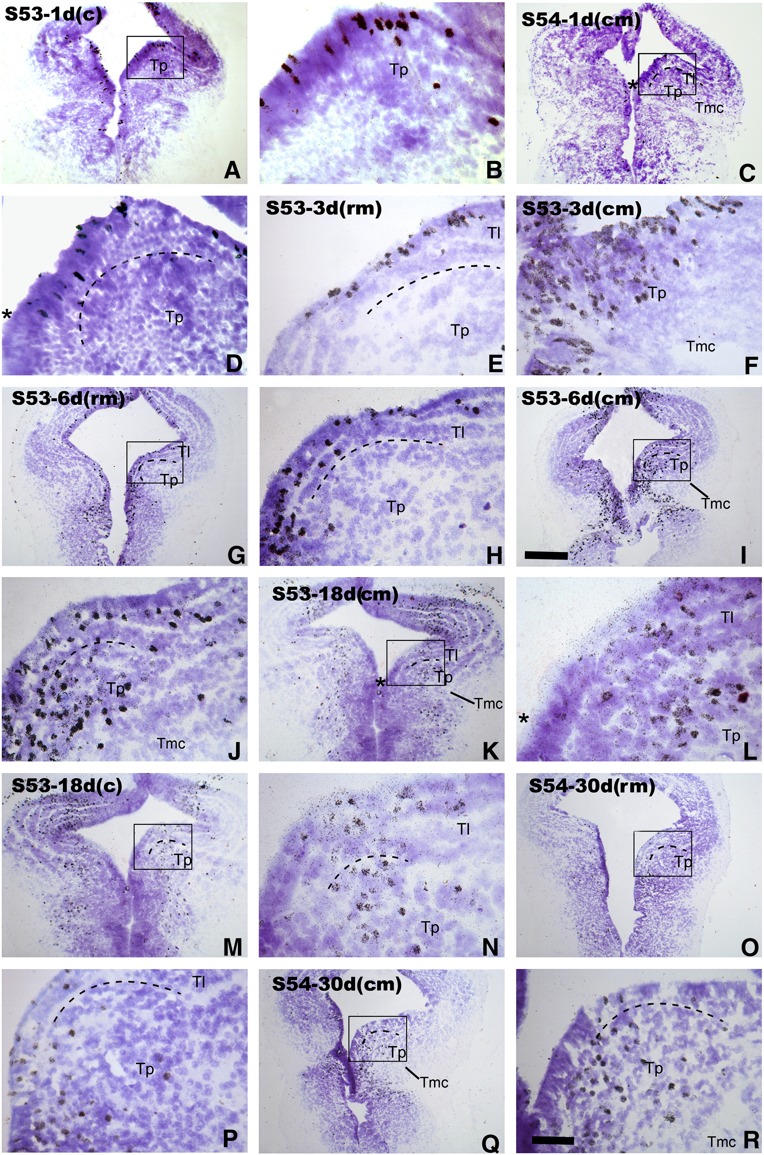 Labeling in torus semicircularis (Ts) after the injections of [3H]-thymidine into tadpoles at S53 or 54. Tadpoles were allowed to survive for 1 d (A to D), 3 d (E and F), 6 d (I and J), 18 d (K to N), or 30 d (O to R). The boxed areas in A, C, G, I, K, M, O, and Q are further magnified in the next image. The asterisks in K and L show the germinal sites of Tmc. The brain levels of the figure located (c: caudal, cm: caudomedial, rm: rostromedial, and r: rostral) are shown in Fig. 1. Scale bar = 200 μm for A, C, G, I, K, M, O, and Q and 50 μm for the others. For the abbreviations, see list.
